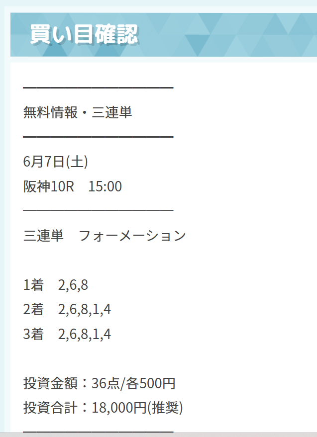3番人気×4番人気の馬連を買い目点数6点で無料予想としてもらって